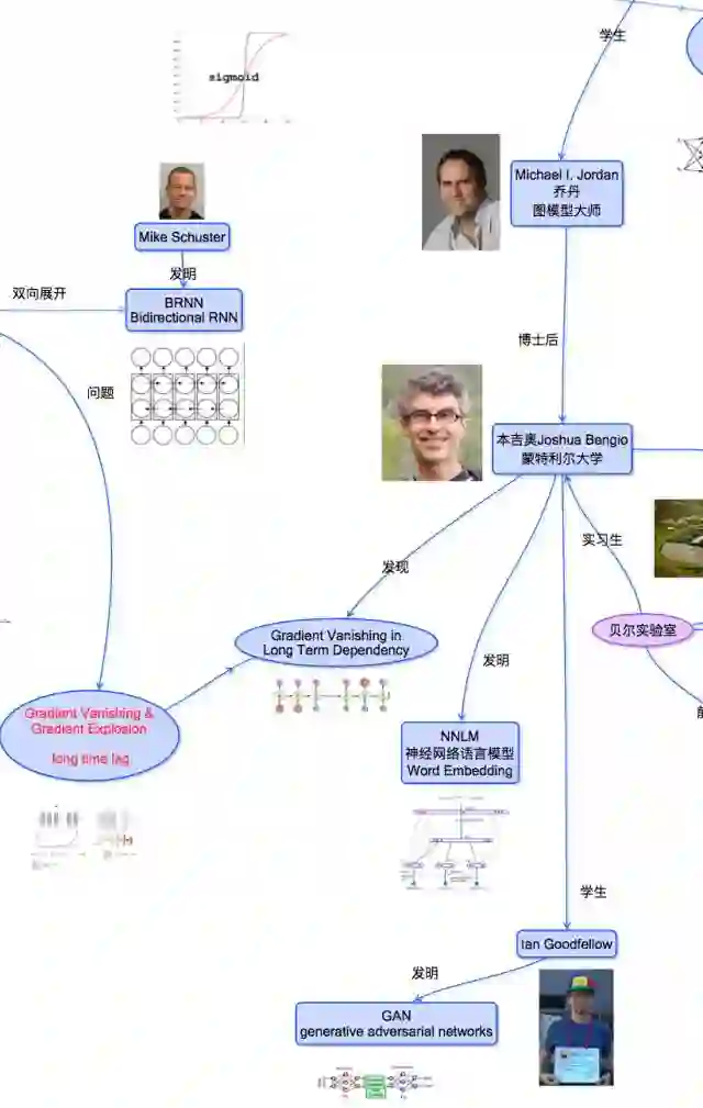 虽然Hochreiter发现并且发表了这个梯度消失的问题, 但是却是德文的, 影响力大打折扣。 并且也没有太混连接主义的圈子。 真正开启影响的是Bengio。 Bengio是利用神经网络做自然语言处理的大师, 他在利用RNN做Long Term Dependency的问题也发现了梯度消失了。 而这个Bengio就是Rumerhart学生Jordan的博士后。 这一下子就接触了连接主义的核心圈子了。 那时候, 这些核心圈的人Jordan还有Hinton在做贝叶斯网络图模型的(参考”给能量以自由吧!“ 系列)。