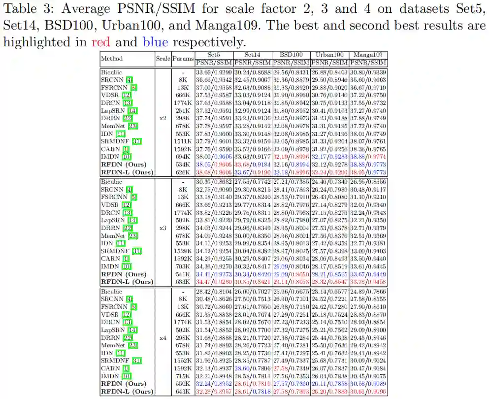 该文是南京大学提出的一种轻量&高效图像超分网络,它获得了AIM20-ESR竞赛的冠军。它在IMDN的基础上提出了两点改进,并引入RFANet的一种ESA注意力模块。如果从结果出发来看RFDN看上去很简单,但每一步的改进却能看到内在的一些思考与尝试。值得初入图像复原领域的同学仔细研究一下该文。