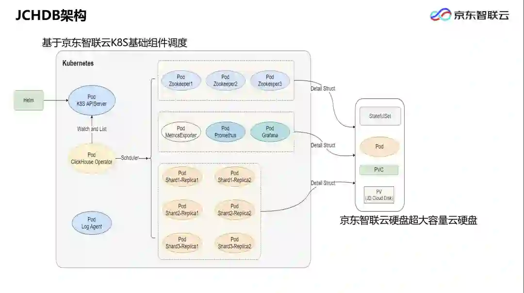这个服务还会创建一个绑定 headless service ip 地址的域名,用户可以通过这个数据库域名直接连到这一套 Clickhouse 系统上。由上图右可见,这个 Pod 的底层存储使用了京东的云硬盘,它会在建 Pod 时申请一个 PVC 控制器,PVC 控制器会绑定京东云硬盘。这样就形成了计算与存储分离的架构,可以进一步提升计算能力。