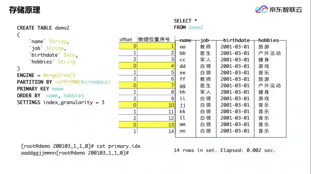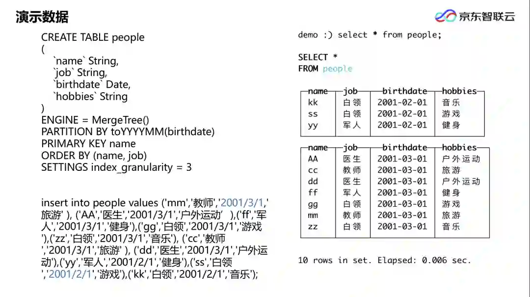 本例中,我们根据出生日期做一个数据分区,主键选用用户的名字,并设置 SETTINGS index_granularity=3。表建成后插入 10 条记录,分为 2001 年 3 月和 2001 年 2 月两个数据区间。表建完、数据写完以后,Clickhouse 默认会在数据文件存放路径下建一个相应的表名: