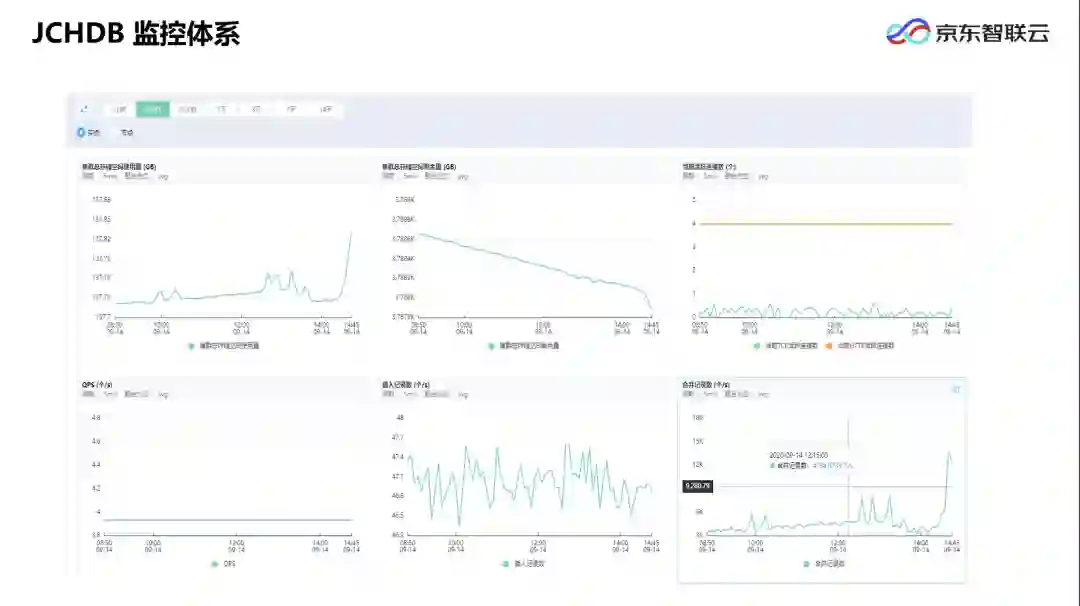 京东智联云还提供了完善的监控体系,可以帮助 DBA 更好地观察的数据库的运行状况。平台不但提供了 service 级别的数据库监控,同时还能把所有 Pod 所使用的磁盘空间、CPU、内存都展示给用户。有了这些信息,用户可以更加直观地观察到每一个 Pod 的压力分布情况,进而方便灵活地调整数据压力,避免某个 Pod 出现数据瓶颈。