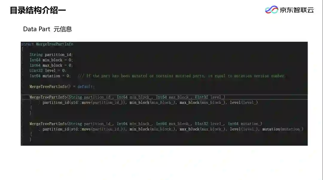 上图是 MergeTree 中对 Data part 进行元数据管理的结构体。其中,partition id 代表数据所处的分区 id;min block、max block 代表数据写入的版本信息——用户每次批量写的数据都会生成一个 Data part,同一批写入的数据会被标记为唯一的 block number。MergeTree 存储引擎后台会定期通过异步任务合并数据,且只会合并位于同一个数据分区内的数据,还要求 min block 和 max block 数据区间必须是连续非重合的。