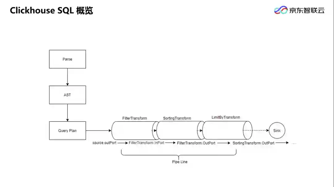 Clickhouse 的物理执行计划可认为是一个数据流图,也就是数据的有向无环图。在这个图里,数据从一个管道传到另一个管道,也就是从一个操作符传到另一个操作符。查询执行器是用来执行计划的引擎,它会从存储引擎中取出数据,并返回给客户端。