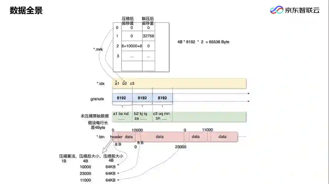 结合前文例子来看数据全景。假设下面绿颜色的就是要写入的一批数据,存放用户的名字;假设每个名字占用 4 个字节,可以看到绿颜色上边有一个 granule,写的是 8192。指定 granule 是 8192 之后,数据在写入时会放到一个具有缓冲区的 OutPort 流中,按照一个 granule 一个 granule 来写;写完第一个 granule,当发现这个缓冲区内数据大小超过 64KB,这时就会把数据进行压缩落盘,放在下边的粉红色文件块里。落数据块时会先写一个文件头,文件头由三部分组成,如上图所示。