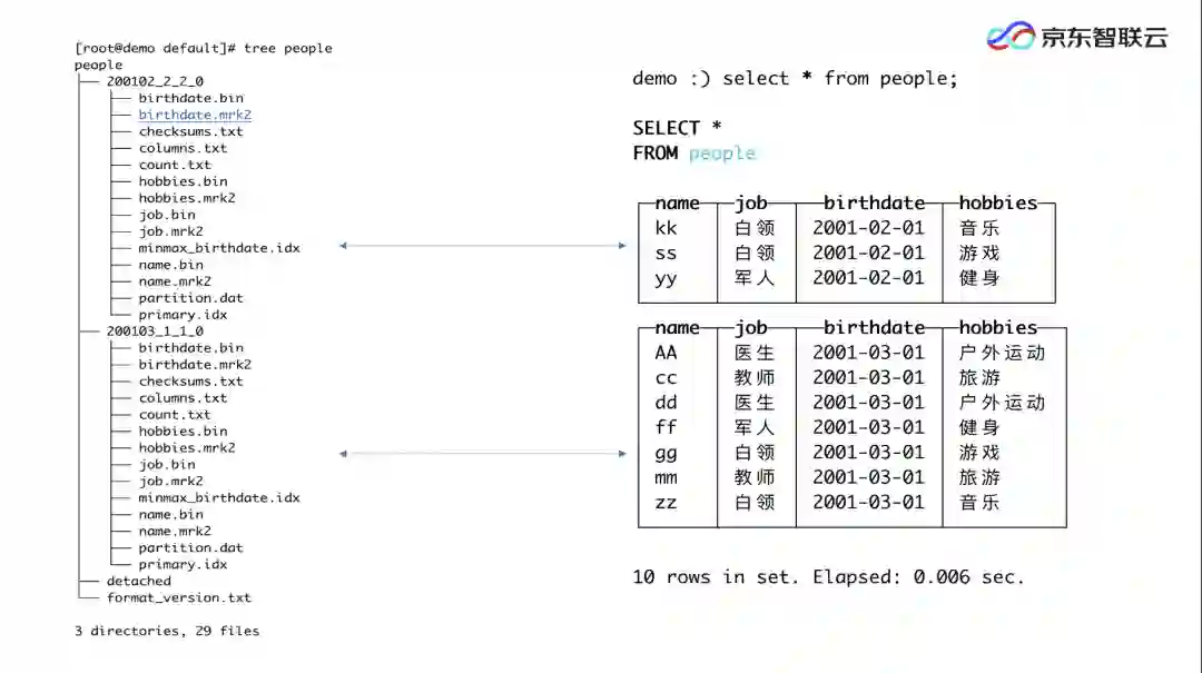 这里可以看到,10 条数据分了两个文件夹来存储。文件夹命名时,其第一部分是分区键,也就是出生日期;1_1(2_2)代表每个数据分区内数据块最小块和最大块的编号。最后的数字 0 代表合并层级。