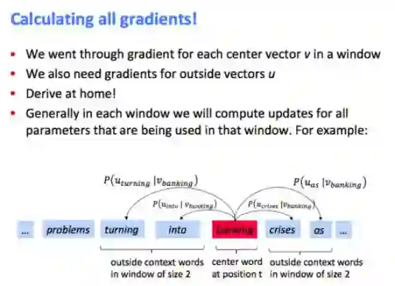 遍历文本中的每个位置t,它有一个中心词和上下文(“outside”)词