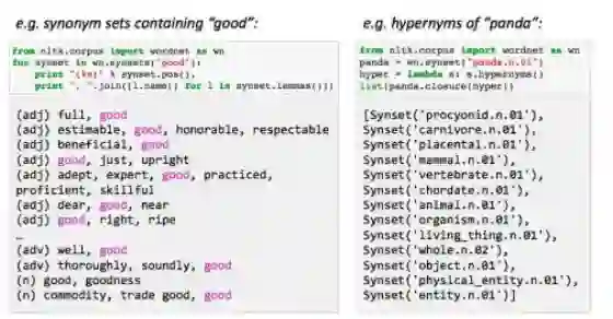 • 常见的解决方案:使用WordNet,一个包含同义词集(synonym sets)和hypernyms(“is a” 关系)的列表的资源。如下图python代码所示: