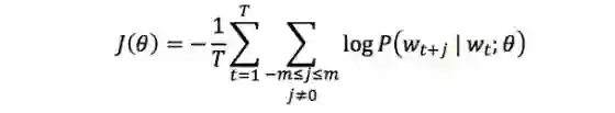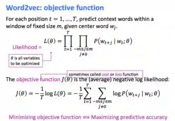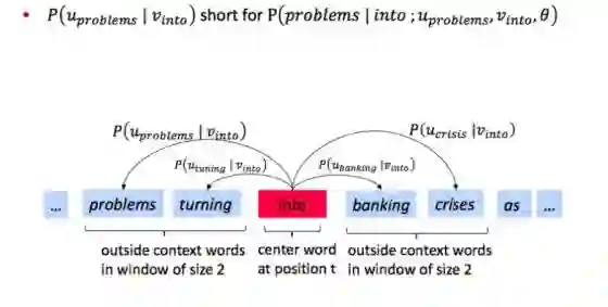 • Word2vec:目标函数(objective function) 对于每个位置,预测在给定中心词的固定大小为的窗口内的上下文词。如下图: