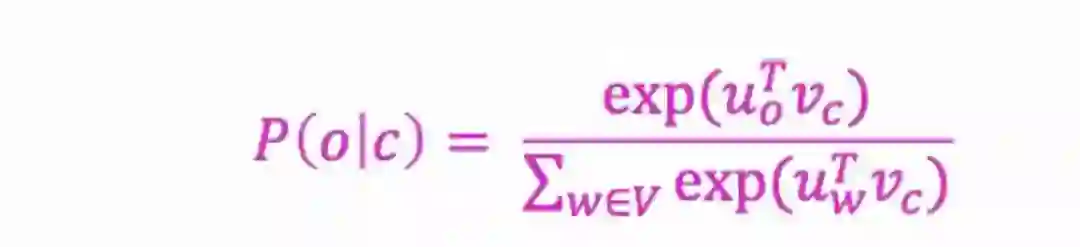 之后,对于中心词c和上下文词o我们可以通过如下公式计算到: