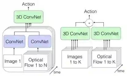 (2) 我们还可以在一个流 (数据的空间信息) 中传递单个图像帧,并从视频 (数据的时间信息) 中传递其相应的光流表示。我们将使用常规的 2D CNNs 从两者中提取特征,然后将它们组合起来传递给我们的 3D CNN,它将组合这两种类型的信息