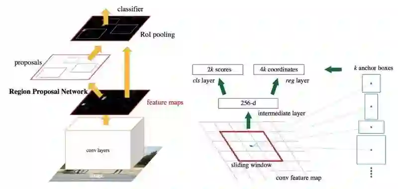 在两阶段检测器中,我们自然有两个网络:一个框提议网络和一个分类网络。框提议网络得到了边界框的坐标,它认为目标在这里的可能性很大;再次提醒,这些坐标都是相对于锚框的。然后,分类网络获取每个边界框并对其中的潜在物体进行分类。