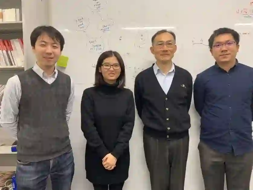 刘蓓(左二)与京都大学导师吉川正俊教授(右二)以及小导师加藤诚(左一)在实验室