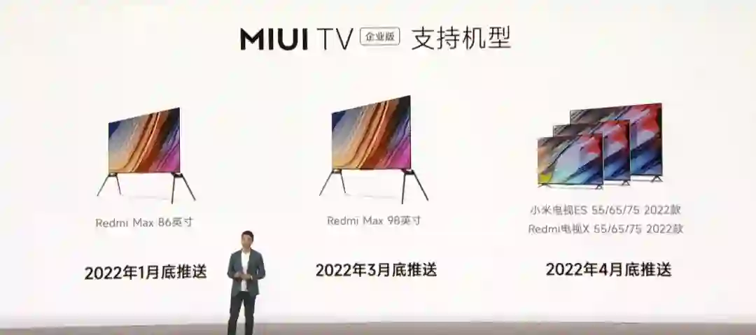 MIUI TV 企业版将于 2022 年 1 月底向 86 英寸电视推送,3 月向 98 英寸电视推送,4 月底向更广泛的 55/65/75 英寸电视推送,届时只需要切换到企业版就可以体验最新的功能。