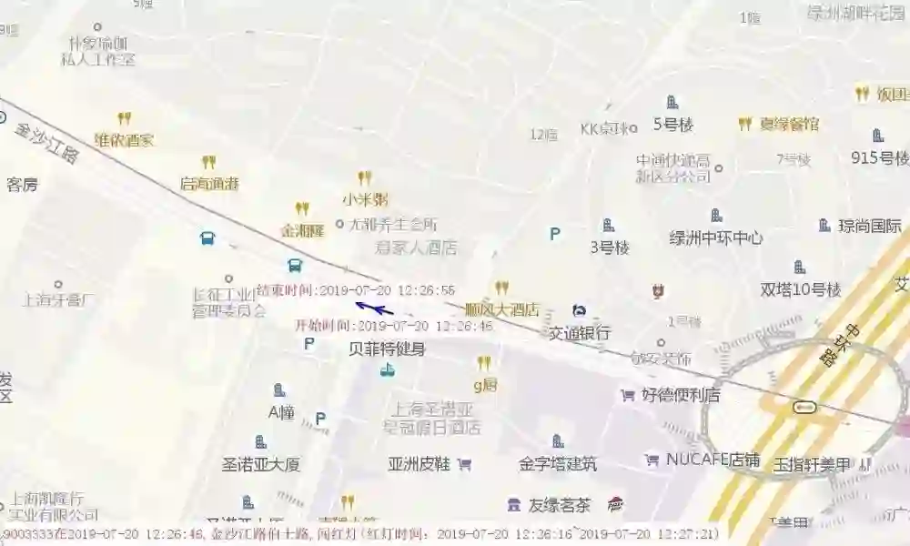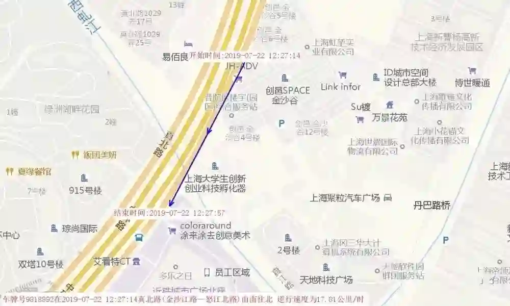 视频:违法当事人闯红灯◆ 违法当事人在真北路靠近金沙江路占用人行道骑行(见图7),RFID电子车牌捕捉到超出规定范围的信号轨迹。![]()