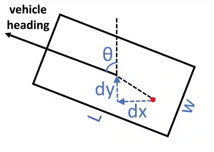 图3:一个正样本(红色像素点)的几何输出参数化。学习的目标参数为{cos(θ), sin(θ), log(dx), log(dy), log(w), log(l)},参数事先在训练集上规范化,具有零均值和单位方差。