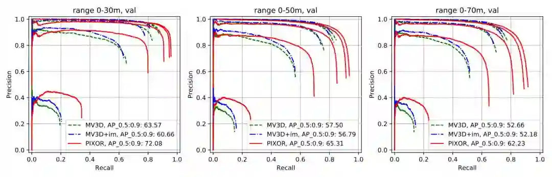 图4:在Kitti Val集上对PIXOR和MV3D进行评价,我们为每种方法绘制了5条精确召回曲线,对应于0.5~0.9之间的5个不同IOU阈值,并汇报平均AP(%),我们在三个不同的范围进行比较。
