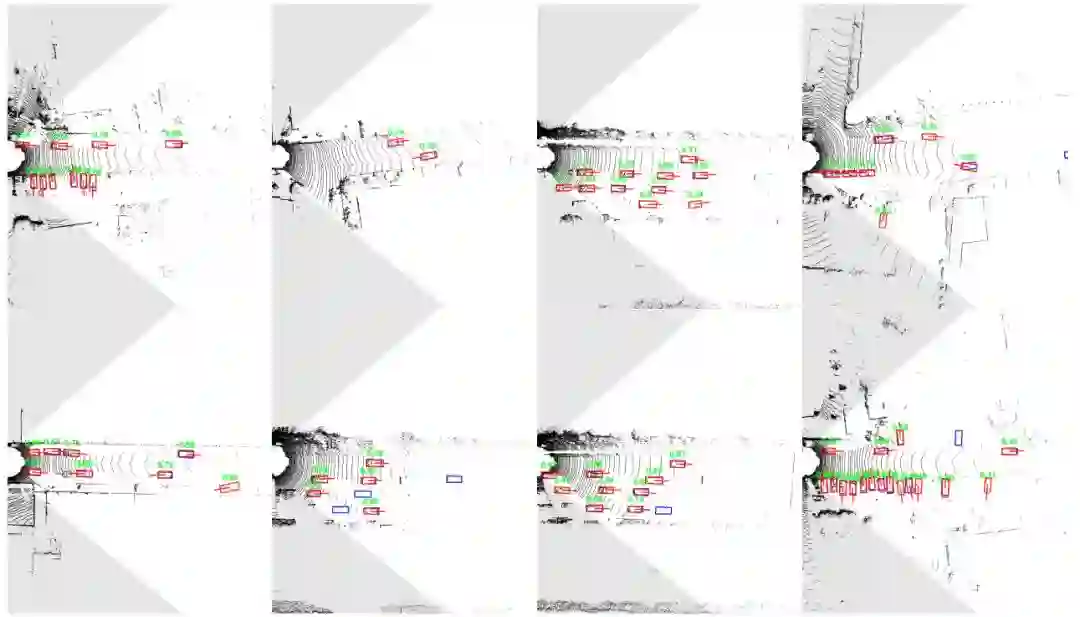 图6:PIXOR在Kitti物体val集上的实例检测结果。检测结果用红色标志,而正确的真实数据用蓝颜色标注。灰色区域超出了相机视野范围所以没有标签。