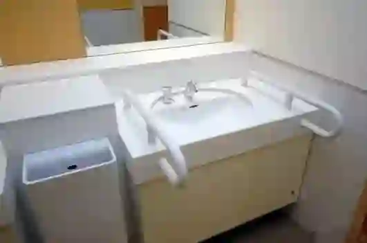 女厕所,镜前是化妆台,意在分流人群,避免有人洗完手继续化妆造成排队。