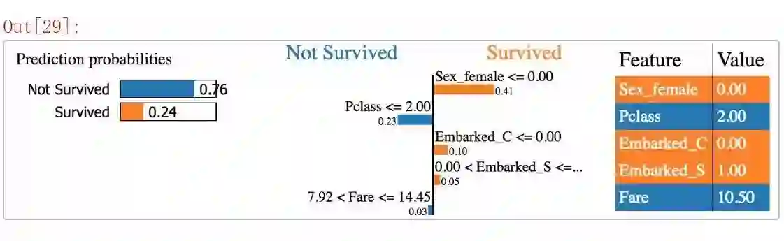 特征重要性可能是理解一般的特征重要性的不错方法。假如出现了这样的特例,即模型预测一个高票价的乘客无法获得生还,则我们可以得出高票价并不必然导致生还,接下来我们将分析可能导致模型得出该乘客无法生还的其它特征。
