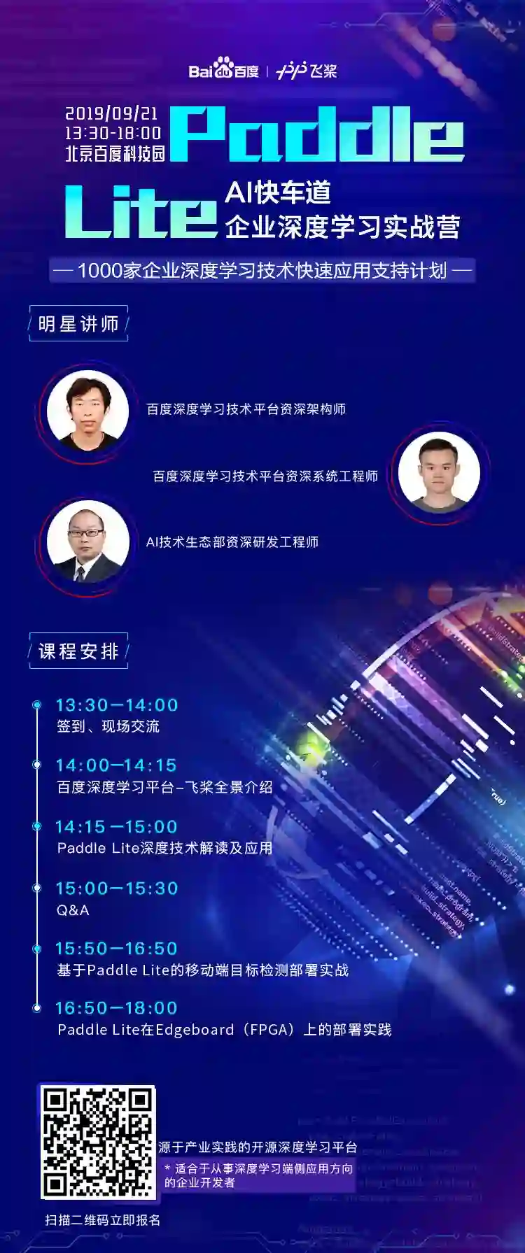9 月 21 日,【百度 AI 快车道企业深度学习实战营】 走进北京百度科技园,由百度深度学习技术平台资深架构师、百度深度学习平台系统工程师主讲,详细解读 Paddle Lite 的技术特点、使用方法和相关应用。通过现场实践来实现目标检测模型在手机上的部署,完整体验 Paddle Lite 在实际业务中的应用。此外还有在 FPGA 设备上进行蔬菜识别部署等多个趣味实践,帮助来到现场的你进行深度学习的实战练习。