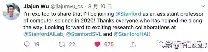 吴佳俊说:“很高兴告诉大家,我将于2020年加入斯坦福大学担任计算机科学助理教授!感谢一路上帮助我的每一个人。期待接下来与斯坦福AI实验室、斯坦福视觉学习实验室以及斯坦福以人为本AI研究院激动人心的研究合作!”