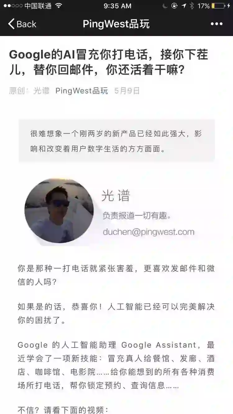 By the way,在品玩主笔这篇文章讲Duplex技术原理,曾经直接拿微软研究机构的AI论文出来科普解读,也能对“网络中立”原则的是非与争议用人话讲得一清二楚的品玩美国编辑总监光谱老师,是一个不折不扣的英语专业的文科生。