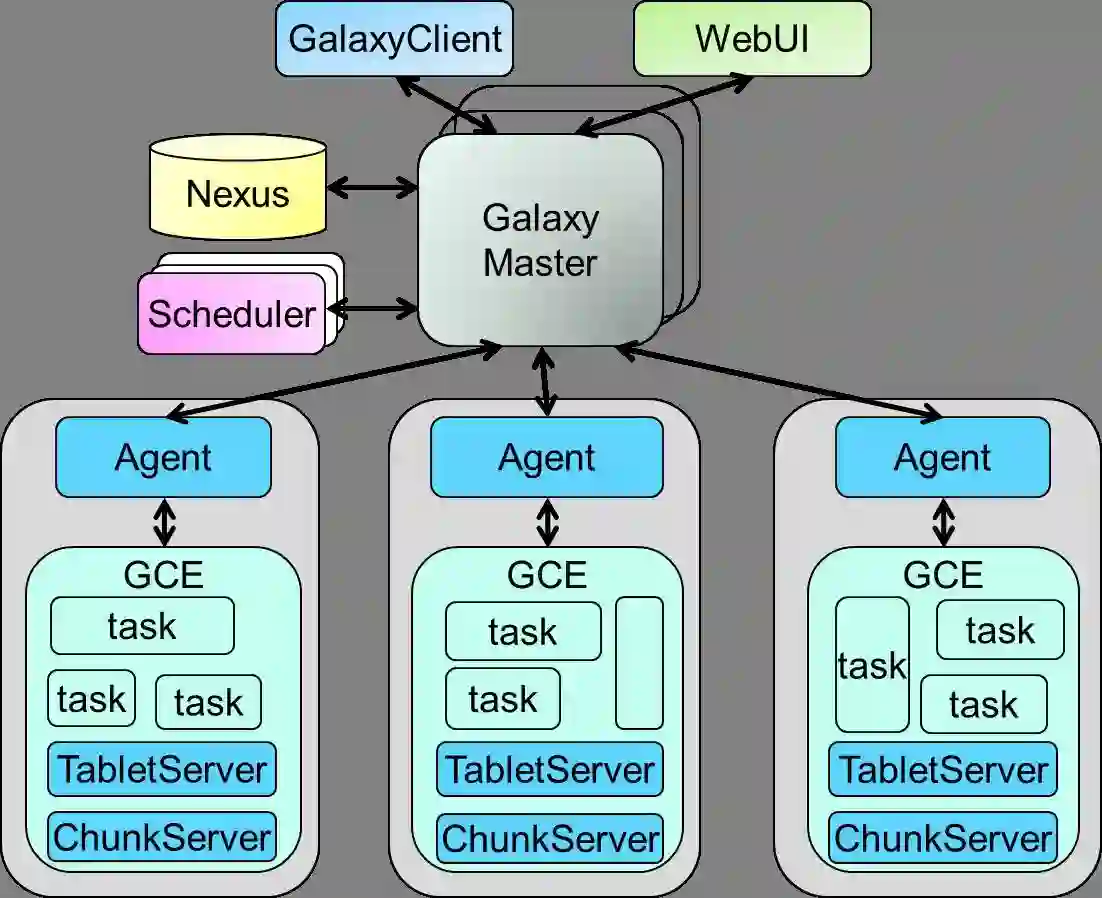 Galaxy 是一个数据中心操作系统,目标是最大化资源的利用率与降低应用部署运维代价,支持万台集群资源调度与管理,目前主要服务于百度网页搜索离线架构业务,解决分布式文件系统,分布式表格系统,以及上层计算模块运维与部署问题。(详情:https://github.com/baidu/galaxy)