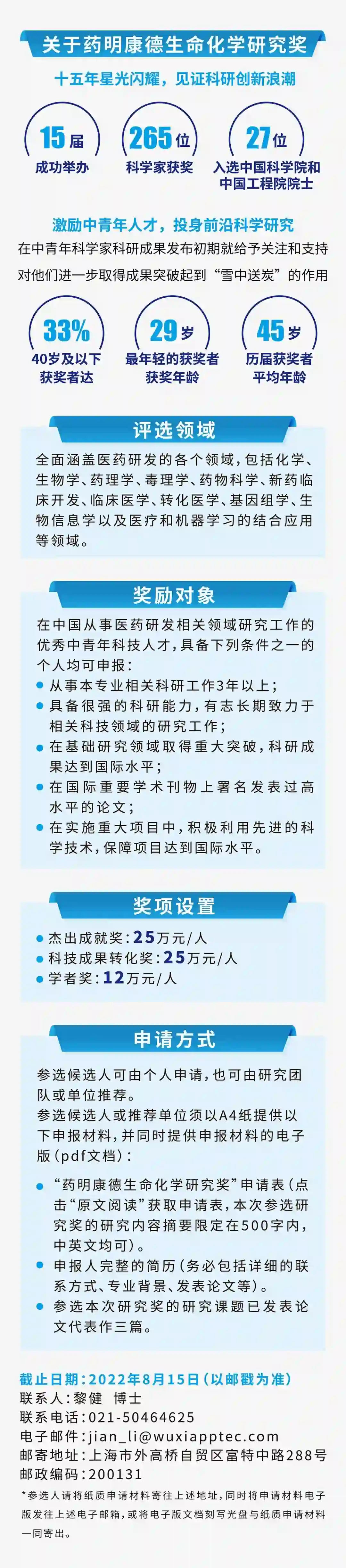 为了凝聚科学智慧,促进科研成果转化,更好地造福全球病患,第十六届药明康德生命化学研究奖评选活动已重磅来袭!