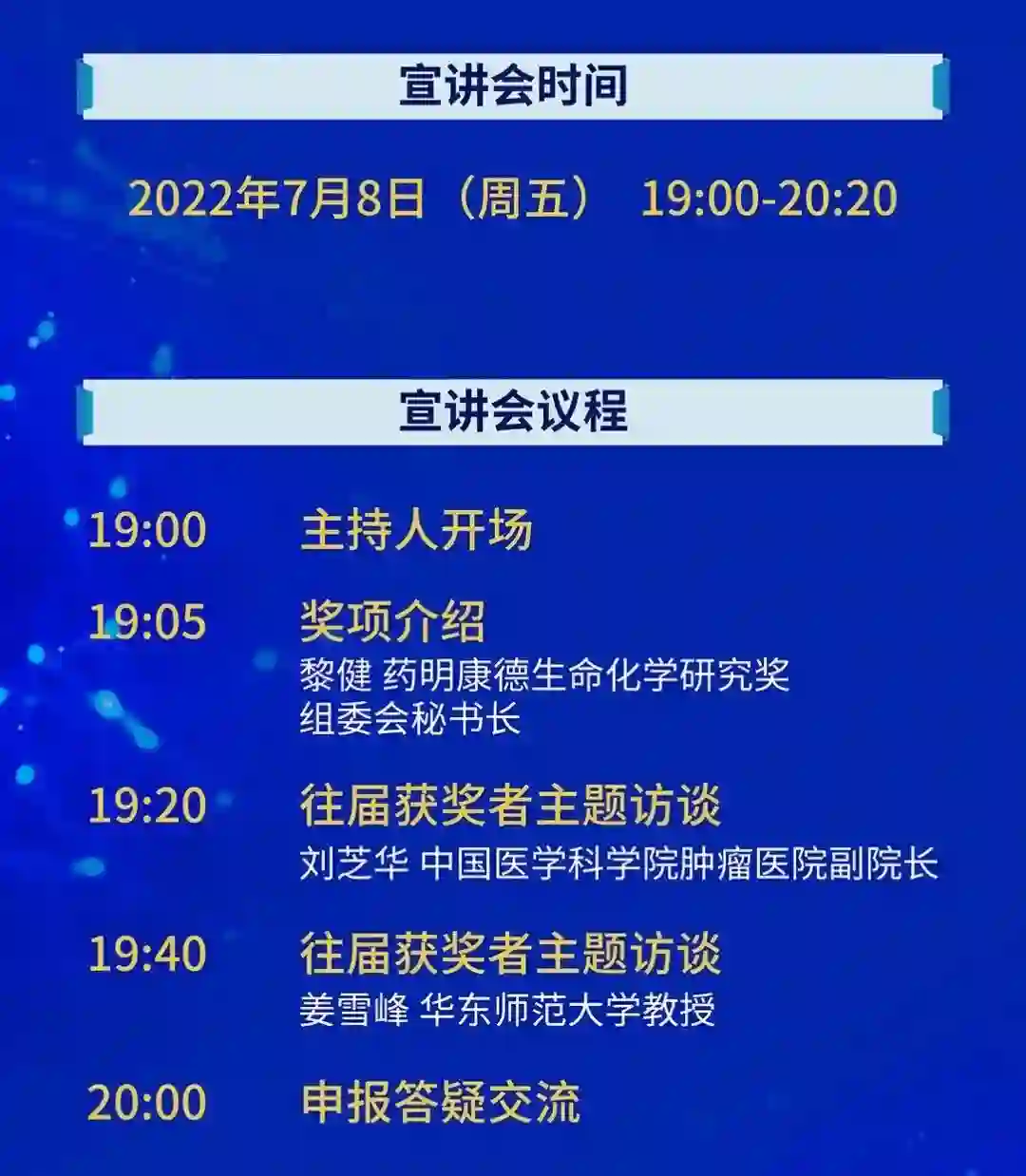就在今晚7点(7月8日),药明康德首次推出线上宣讲会,在线解答申报人的疑问,有两位大咖获奖者讲述自己的学术创新成果,并与产学研同仁,分享自己的心路历程。你关心的问题在这里都能找到答案!