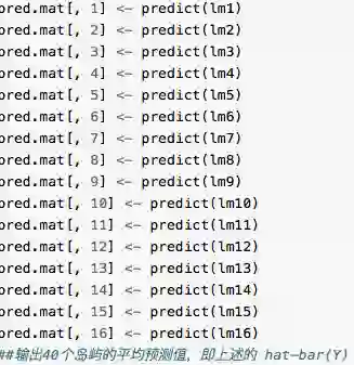 bird.pred <- pred.mat %*% summary(lm.ave)$msTable$weight[c(4,14,3,2,7,16,10,13,1,8,5,6,9,15,12,11)]round(t(bird.pred),2) #把矩阵换方向,给页面省点空间,跟分析无关