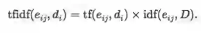 这二者边的建立,可以是 impression, click and/or conversion,一般情况下 impression 的数量远远大于 click,远远大于 conversion,但是这三者带来的价值却正好是相反的,及 value(impression)<value(click)<value(conversion)。基于这个问题,我们借鉴 tf-idf 的思想,我们假设节点之间的边是一个 document,三种不同种类的节点是三个独特的 term。假定 f(eij,di) 是 term eij 在 documentdi 出现的频次,我们使用以下 log 变换去定义 term 的频率 (tf):
