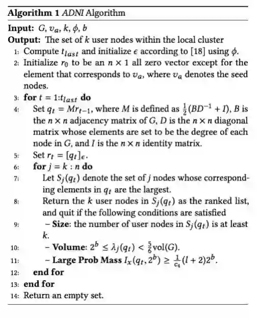 分割大图确实是一个计算上的重要问题:存在很少的方法可以在接近甚至 O(n2) 或 O(m) 的时间内对 n 个顶点和 m 个边缘进行分割。近年来的一个突破是图形分割的局部方法的出现,实现了边缘数量接近线性的时间复杂性。这些方法中的第一种是通过称为 NIBBLE[1] 的局部聚类算法来实现的。NIBBLE 可以最大限度地减少无向未加权图的聚类质量公制切割电导。给定一个起始顶点,它可以证明在时间上靠近该顶点的簇 (O(2blog6m)/ϕ4),其与输出簇的大小成比例。寻找一个与其大小成正比的时间段是本身非常有价值的例程,作者展示了如何使用 NIBBLE 作为一个子例程,从大图中重复删除小簇,以获得近似线性的时间图分区算法。后来使用 PageRank 向量扩展了 NIBBLE,并且表明,通过单个 PageRank 向量的扫描可以得到具有 cut conductance 为ϕ的切割。