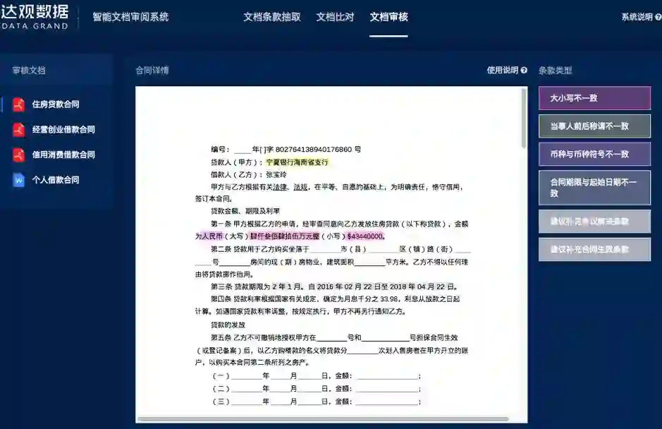 达观数据的文档智能审阅系统可以一键审核数十种常见风险。