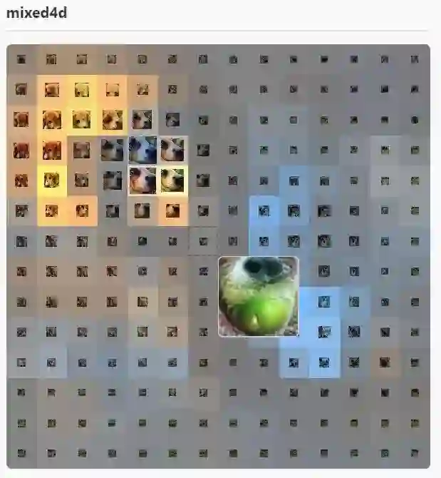 上图的界面为我们提供了较为灵活的归因关系。首先,我们从每个隐藏层的每个空间位置向所有 1,000 个输出类显示属性。为了将这个 1000 维的向量可视化,我们使用降维来产生多向显著图。在我们多尺度的激活网格上叠加这些显著图,从而提供归因空间的信息。激活网格能够将语义词典建立的视觉词汇属性固定下来。在某个像素上悬停,我们可以看到这个空间位置最有助于哪些类别的输出。