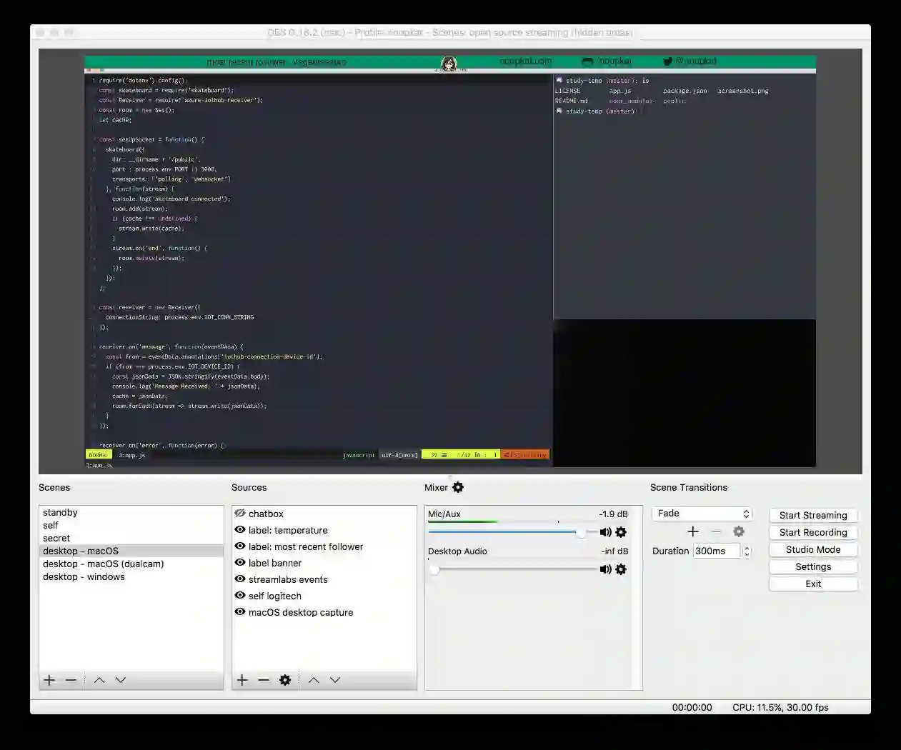 一周后,我设置好了Twitch房间信息,使用OBS工具,我准备开始直播了。我一直维护着 Avrgirl-Arduino这个库,我想我在直播的时候也做这个库的工作好了。第一次直播是很困难的,那时我很紧张,前天晚上熬夜还在不断的排练着直播时准备讲的内容。