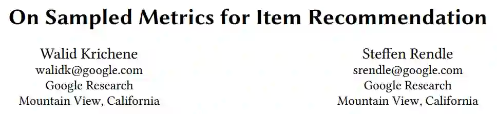 Walid Krichene and Steffen Rendle. 2020. On Sampled Metrics for Item Recommendation. In Proceedings of the 26th ACM SIGKDD International Conference on Knowledge Discovery & Data Mining (KDD '20). DOI:https://doi.org/10.1145/3394486.340322