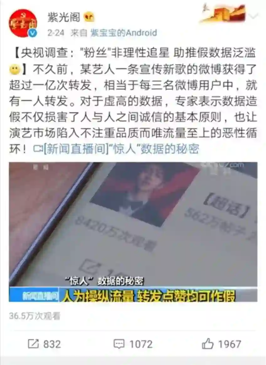 “紫光阁”1月发布的微博称,“唯数据论、唯流量观使从业者不能聚焦于作品和艺术本身,也使粉丝们陷入流量的“囚徒困境”式攀比,更使得相关领域的黑产一本万利、无所不用其极,最终置法律和他人权利于不顾。”
