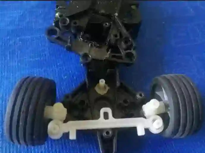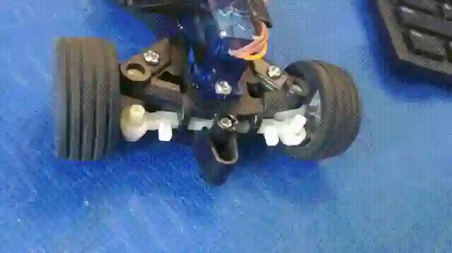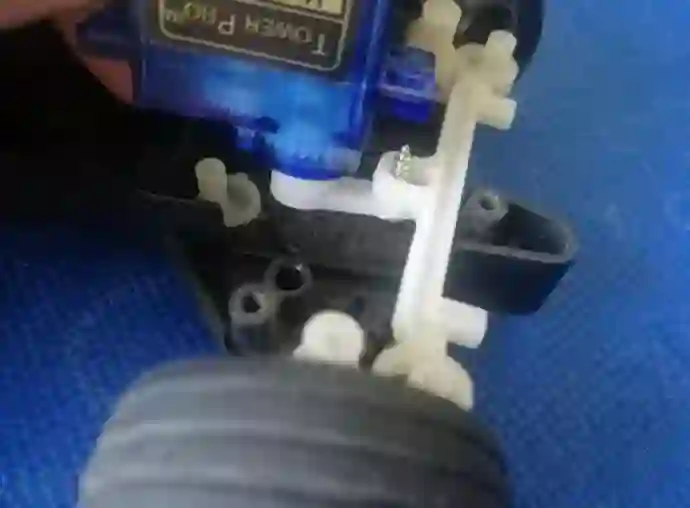 将舵机的舵把用螺丝固定,舵把在合适的位置拧上一个长螺丝钉,但是不要太长以免无法合盖。舵把的螺丝钉扣住玩具小车转向装置中间的洞。舵机牵拉,便可达到一个转弯的效果。