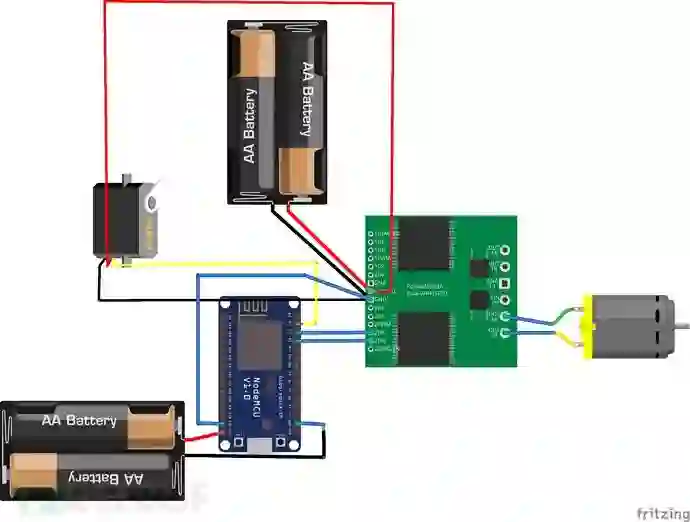 如图,我使用外置5V电源来驱动舵机与马达,值得注意的是,舵机要与Nodemcu共地(地线接一块)才能控制舵机。