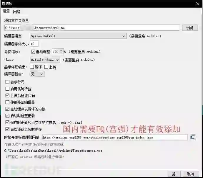 安装完成以后,进入首选项(Preferences),找到附加开发板管理器地址(Additional Board Manager URLs),并在其后添加如下信息: