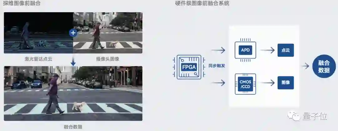 在常规激光雷达传感器的基础上,硬件层面融合进COMS传感器,通过FPGA同步触发,直接在硬件端实现不同类型数据的融合。