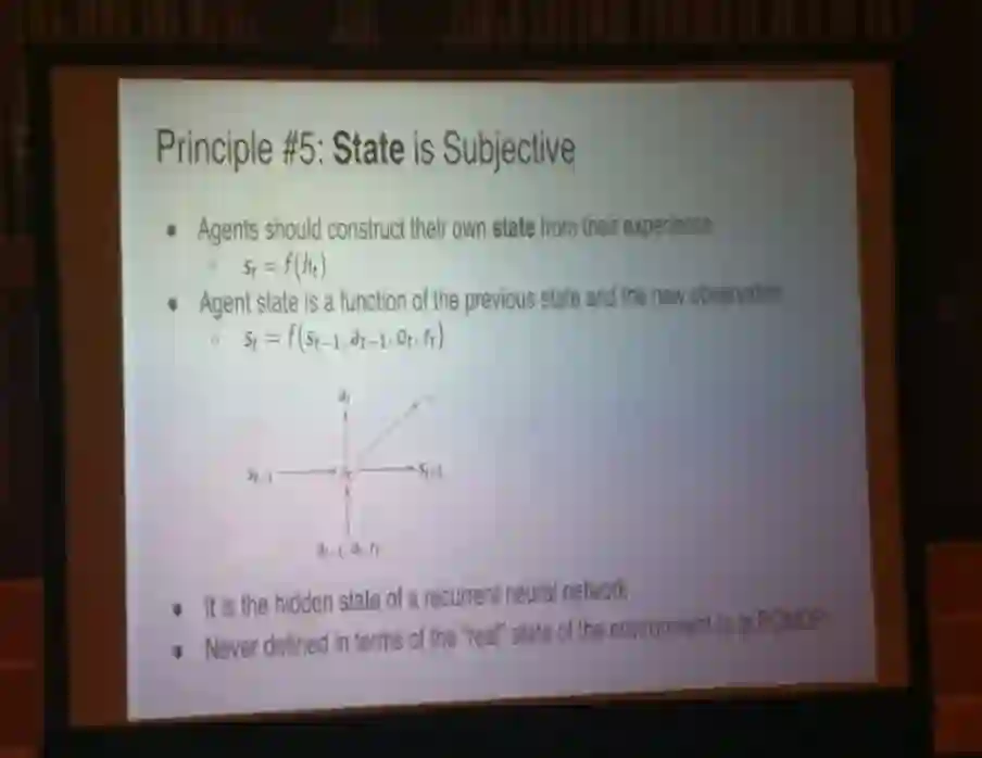 应将状态建立为模型的状态,即RNN的隐藏状态,而不是根据环境定义。只有agent对世界的主观看法才是重要的。不要推理外部现实,因为达到的效果非常有限。