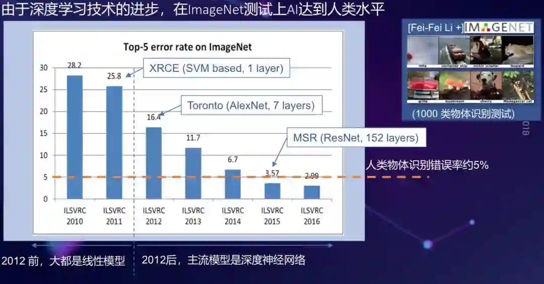 在过去几年,基于深度学习的进步,图像识别也取得极大的成功,比如在 2010 年,李飞飞教授提出的 ImageNet 数据库,定义了一个一千类的物体识别问题,但是在那时候,基于 SVM 等传统模型在这个测试集上的错误率超过 25%。