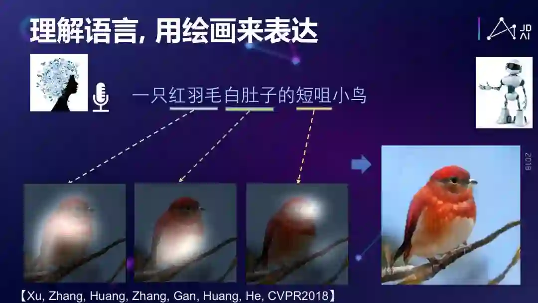 这是完全从无到有的生成,它创造了一个图像,这只鸟也许在这个世界上根本就不存在。这是最近发展很迅速的一个领域,也是语言和视觉跨模态的 AI 模型。当然,它也可以做更多其他的有趣的事情,我们在这里就不一一举例了。