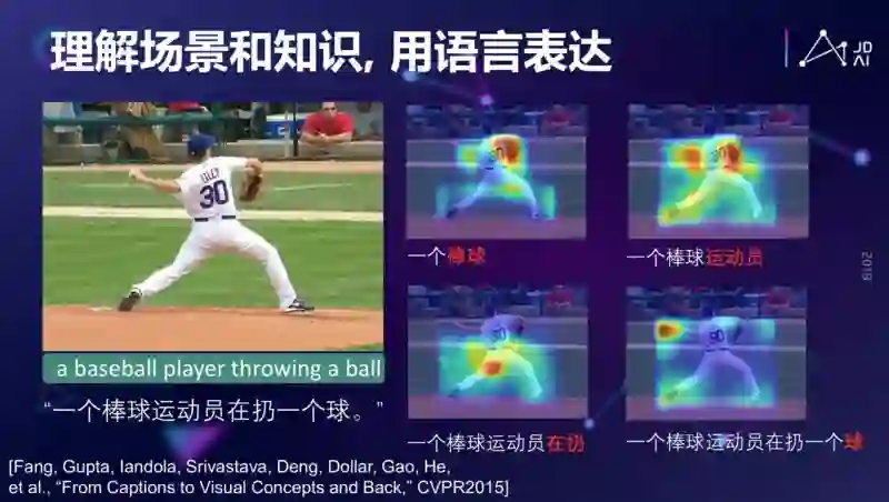 如果我们用深度学习来看上图,会生成这么一句话:一个棒球运动员在扔一个球。为什么会生成这么一句话?比如,我们发现模型“看”成这个图片的时候,它实际上先是注意力集中在棒球手套这个地方,这是一个特征表明这是一个棒球运动。随后当计算机注意到跟广的区域的时候,它会提出这是个运动员。再往下,当 AI 模型注意到一个大腿扭曲的姿态的时候,它会认为这是一个人的动作,凭这些,计算机会认为这是一个人扔球的动作,虽然这个球的占的整面积非常小,但是因为语言模型在语义上的驱动,使得这个球也能够被识别出来,最后形成一句完整的有意义的话。这就是跨越视觉和语言两个模态,从图片到文本描述生成的过程。