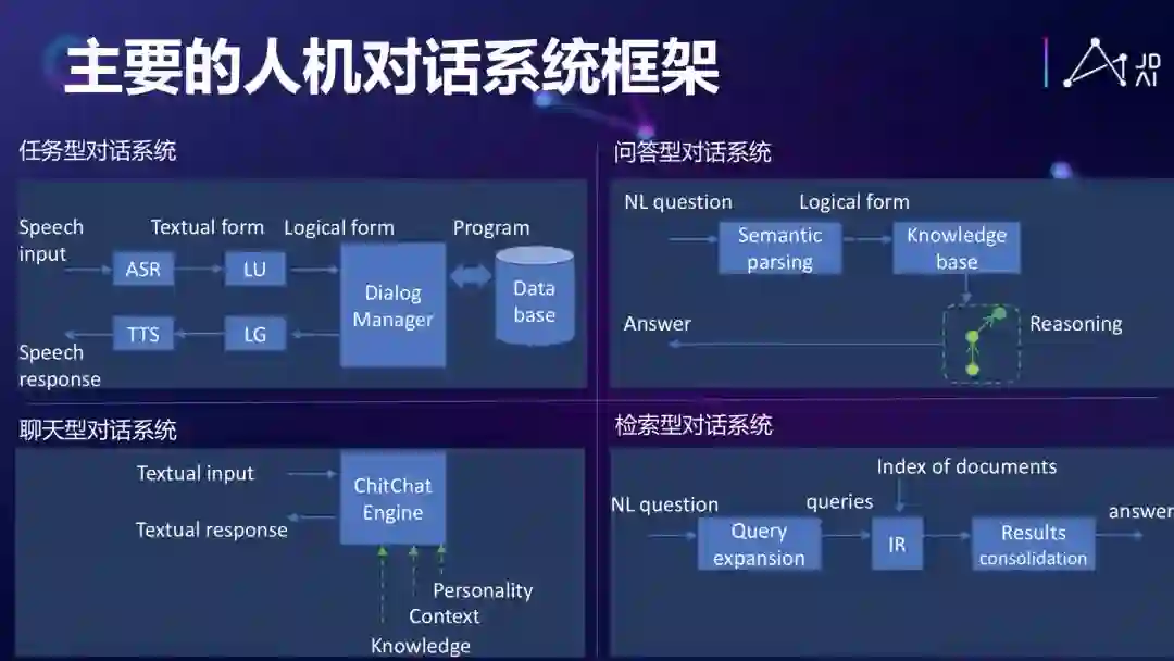 比如有任务型的对话系统、基于知识图谱的问答式对话、聊天型的机器人,如 Eliza、小冰,基于信息检索的系统,甚至可以认为百度本身就是一个对话系统,每次一输进去一个 Request,它会给你一个 document 作为它的 response。