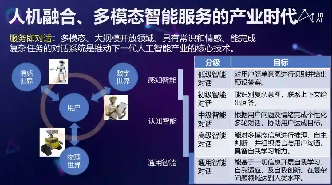 从 AI 角度来说,传统人力密集型产业具有广阔自动化、智能化的空间,但随着 AI 技术、IOT 技术的创新,各种各样的市场迅速成长,如 TOB 的市场、TO C 的市场,多模态技术、具有常识和情感、能完成复杂任务的智能人机交互技术在整个智能服务产业还是有很大的市场和机会的。