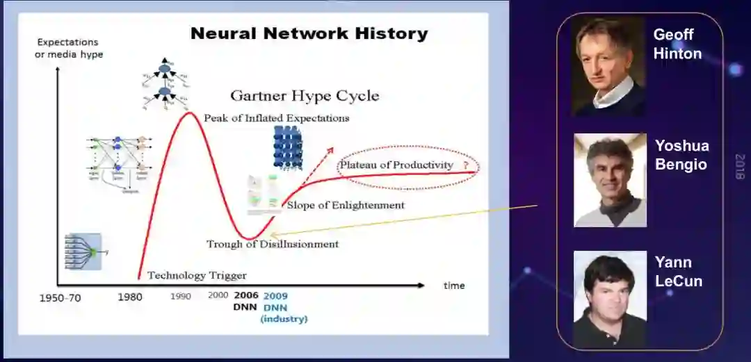 2006 年以后,Geoff Hinton,现在被认为是深度学习之父,提出 RBM 和分层训练方法,开始使训练深层的神经网络成为可能,在 2010 年左右,Hinton 教授跟微软研究院等合作在大规模的语音识别上取得很大的进展。大家重新对深度神经网络产生信心,从那时候开始,大家开始推进对深度神经网络的研究。此后,基于深度学习新的突破,带来了很多 AI 技术的突破,以及产业上的突破,特别是产业界提供了大量的计算力量,提供了真实的场景,进一步促进了 AI 的技术进步。