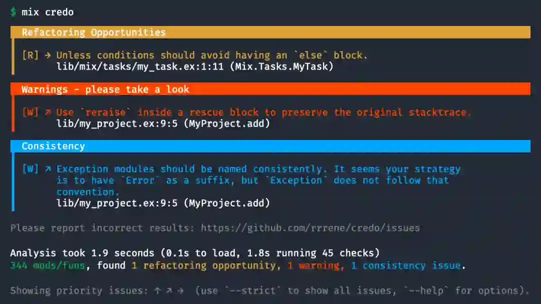 Credo 是 Elixir 语言的静态代码分析工具,专注于教学和代码一致性。它可以向您展示代码中的重构机会、复杂的代码片段、警告您常见错误、显示您的命名方案中的不一致之处,并在需要时帮助您实施所需的编码风格;一些 IDE 和编辑器也能够在后台运行 Credo 并在线标记问题。将 Credo 添加到项目的最简单方法是使用 Mix。