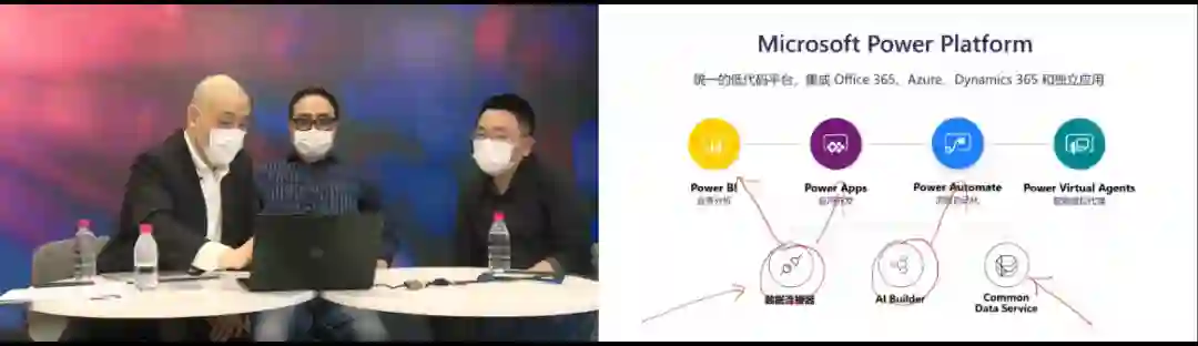 而像微软CEO萨提亚提到下一步大力发展的PowerPlatform,它底下有数据连接器,外面的数据可以连进来,CDS是做数据整理,再有AI的能力。做支撑的有BI应用开发,低代码开发、RPA自动化、机器人。